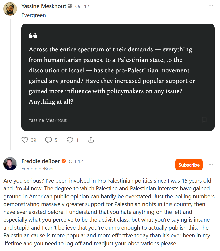 The pattern is hard to miss: Freddie demands material outcomes for Black activism but exempts Palestinian activism from the same scrutiny. Perhaps there’s a principled distinction I’m missing — he’s free to treat one group differently from another, but intellectual honesty requires explaining why. How does one group invite rigorous materialist critique while another gets a pass?